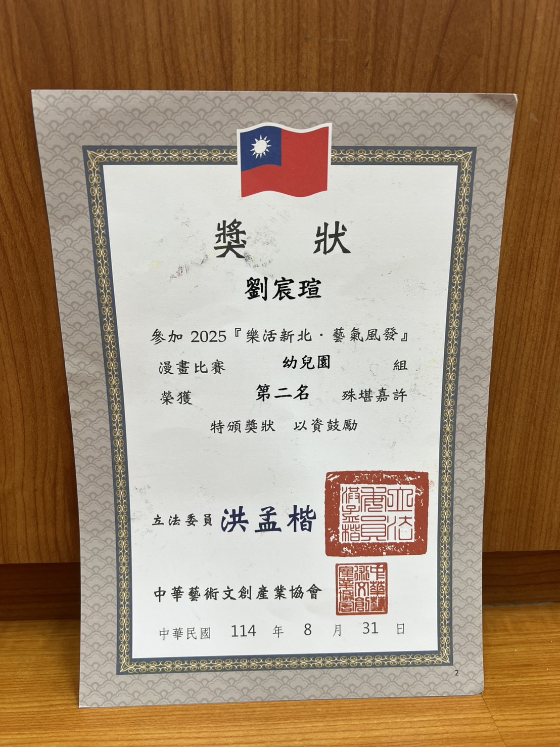~~賀~~ 劉宸瑄 參 加 2025樂活新北,藝氣風發漫畫比賽 幼兒園 榮獲 第二名