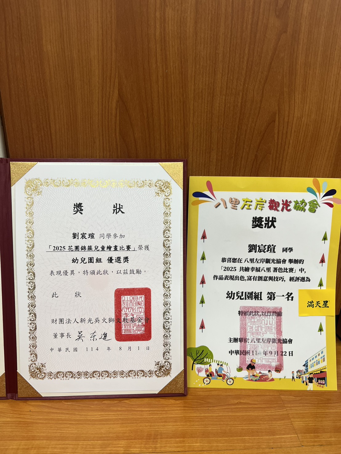 ~~賀~~ 劉宸瑄 參 加 2025花團錦族兒童繪畫比賽 榮獲 幼兒園組優選獎 及 2025共繪幸福八里著色比賽 榮獲 幼兒園組 第一名