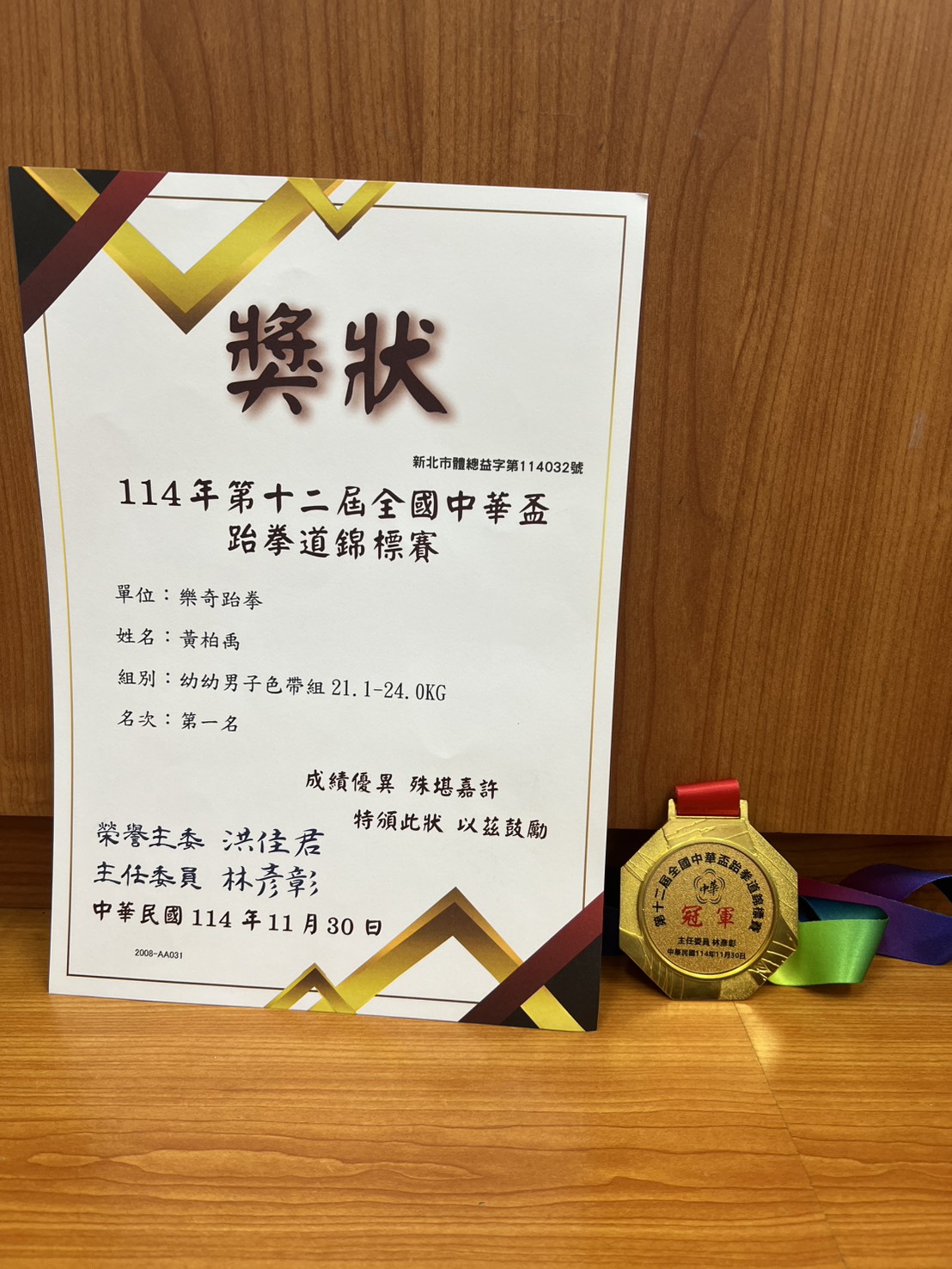 ~~賀~~ 黃柏禹 參 加 114年第12屆全國中華盃 跆拳道錦標賽 榮獲 幼幼男子組色帶組 第一名