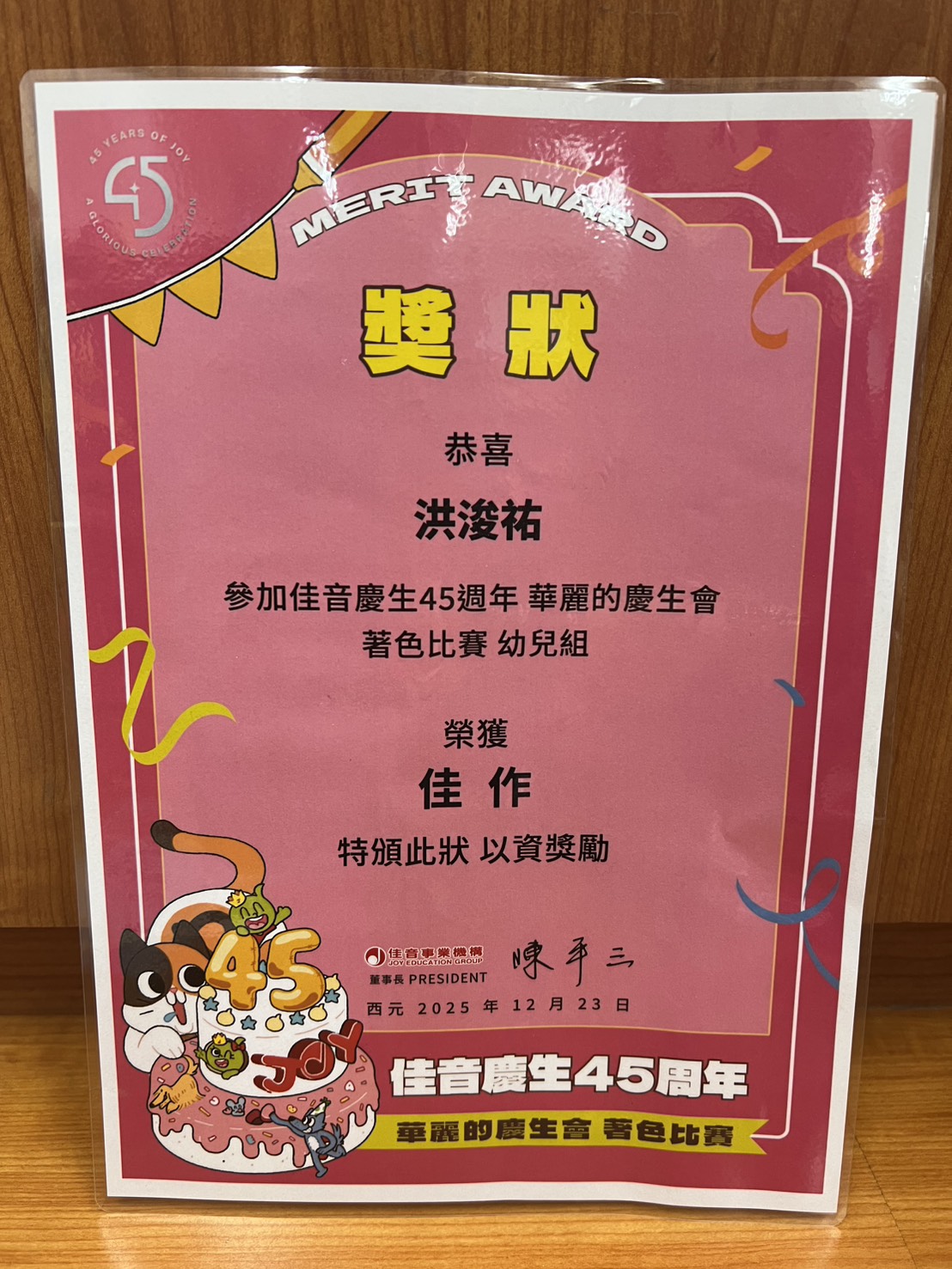 ~~賀~~ 洪浚祐 參 加 佳音慶生45週年華麗的慶生會著色比賽 榮 獲 幼兒園組 佳作
